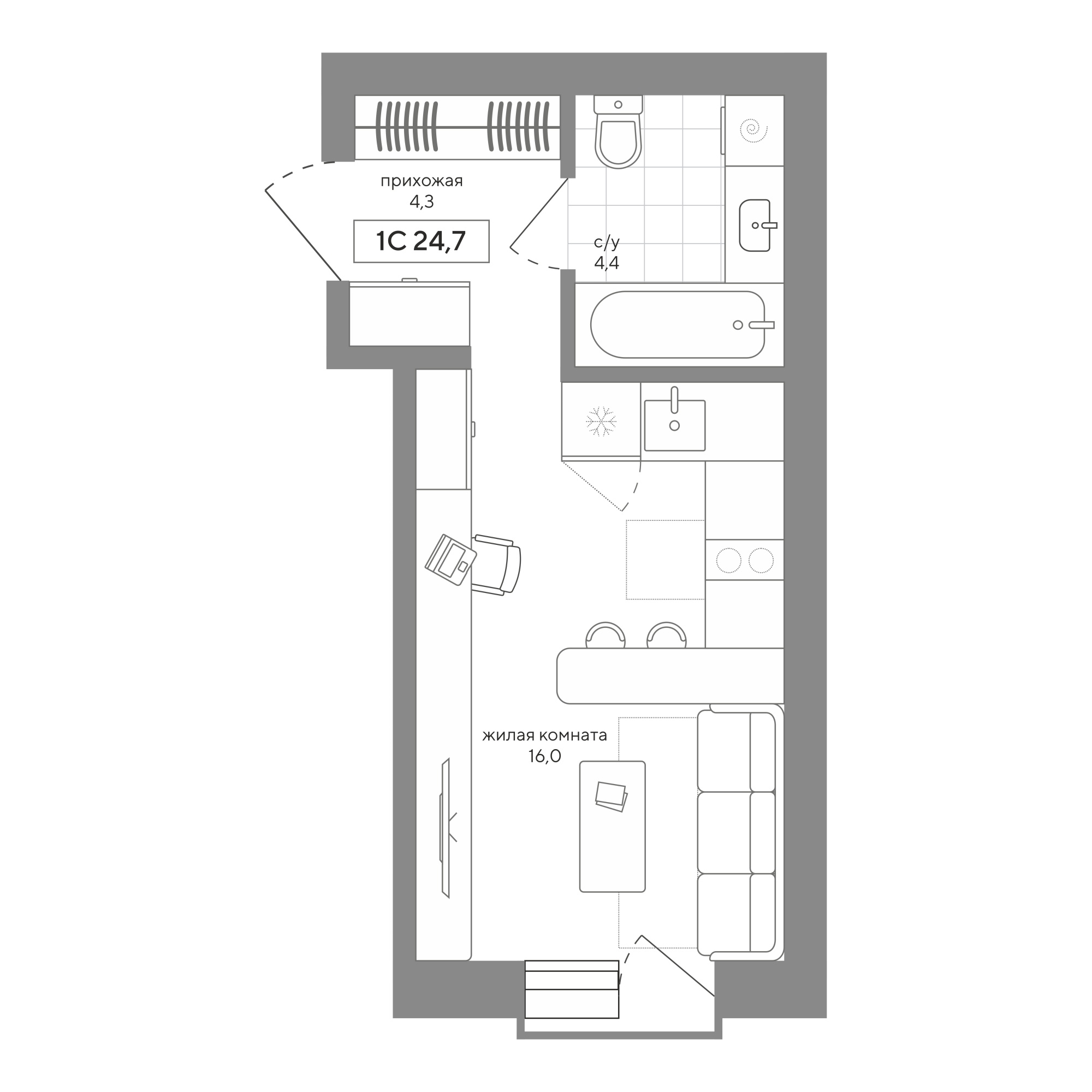 1К студия, 24.66 м², №107